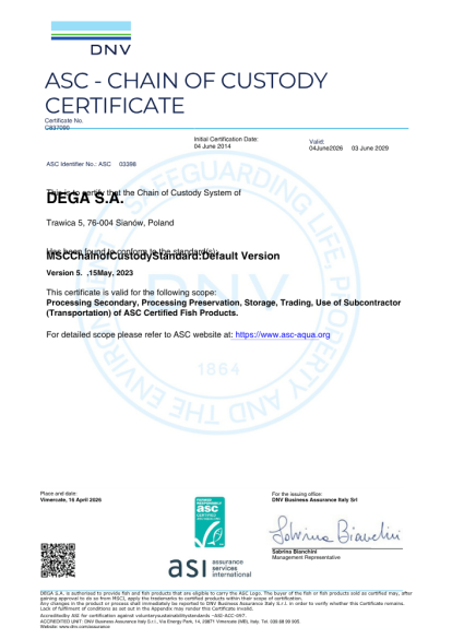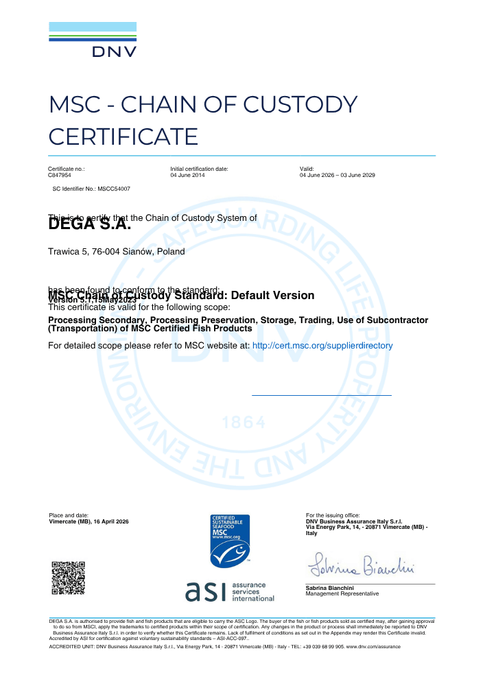 Uzyskaliśmy również pozytywny wynik audytu MSC (Marine Stewardship Coucil) - otrzymując tym samym certyfikat międzynarodowego zrównoważonego rybołówstwa. Uzyskane certyfikaty gwarantują naszym Klientom bezpieczne wyroby, o stałej, powtarzalnej, najwyższej jakości.