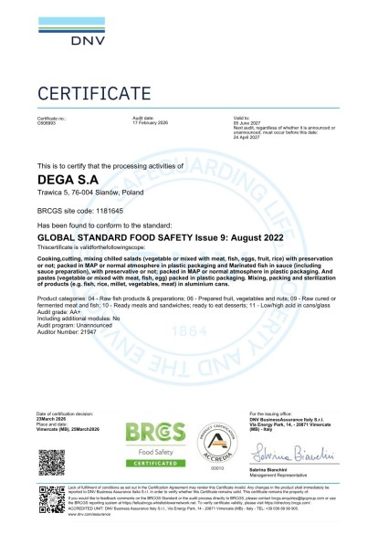 Dzięki konsekwentnie realizowanej polityce rozwoju od 2004 roku jesteśmy przedsiębiorstwem, które spełniło warunki niezbędne do konkurowania na rynku Unii Europejskiej. Corocznie przechodzimy pomyślnie kolejne audyty certyfikujące potwierdzające wdrożony i stosowany Zintegrowany System Zarządzania jakością na zgodność z wymaganiami standardów IFS Food i BRC Food Safety.