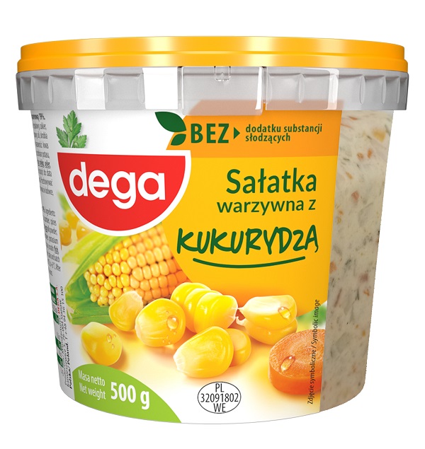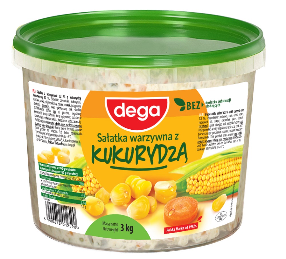Sałatka z warzywami 59 % z kukurydzą konserwową 12 %. Składniki: ziemniaki, marchew, kukurydza, olej rzepakowy, woda, cukier, ogórek, przyprawy (zawierają gorczycę), sól, ocet spirytusowy, skrobia modyfikowana, śmietana w proszku (z mleka), substancje zagęszczające: guma guar, guma ksantanowa; żółtko jaja* w proszku, regulatory kwasowości: kwas mlekowy, kwas cytrynowy; substancja konserwująca: sorbinian potasu; ekstrakt kopru. Produkt może zawierać ryby, seler, nasiona sezamu, pszenicę, soję, skorupiaki. Należy spożyć do: data i numer partii podane na wieczku lub boku opakowania. Przechowywać w temperaturze od 0 °C do +6 °C. Po otwarciu przechowywać w lodówce, spożyć w ciągu 24 godzin. Wyprodukowano w Polsce. *Jaja z chowu ściółkowego