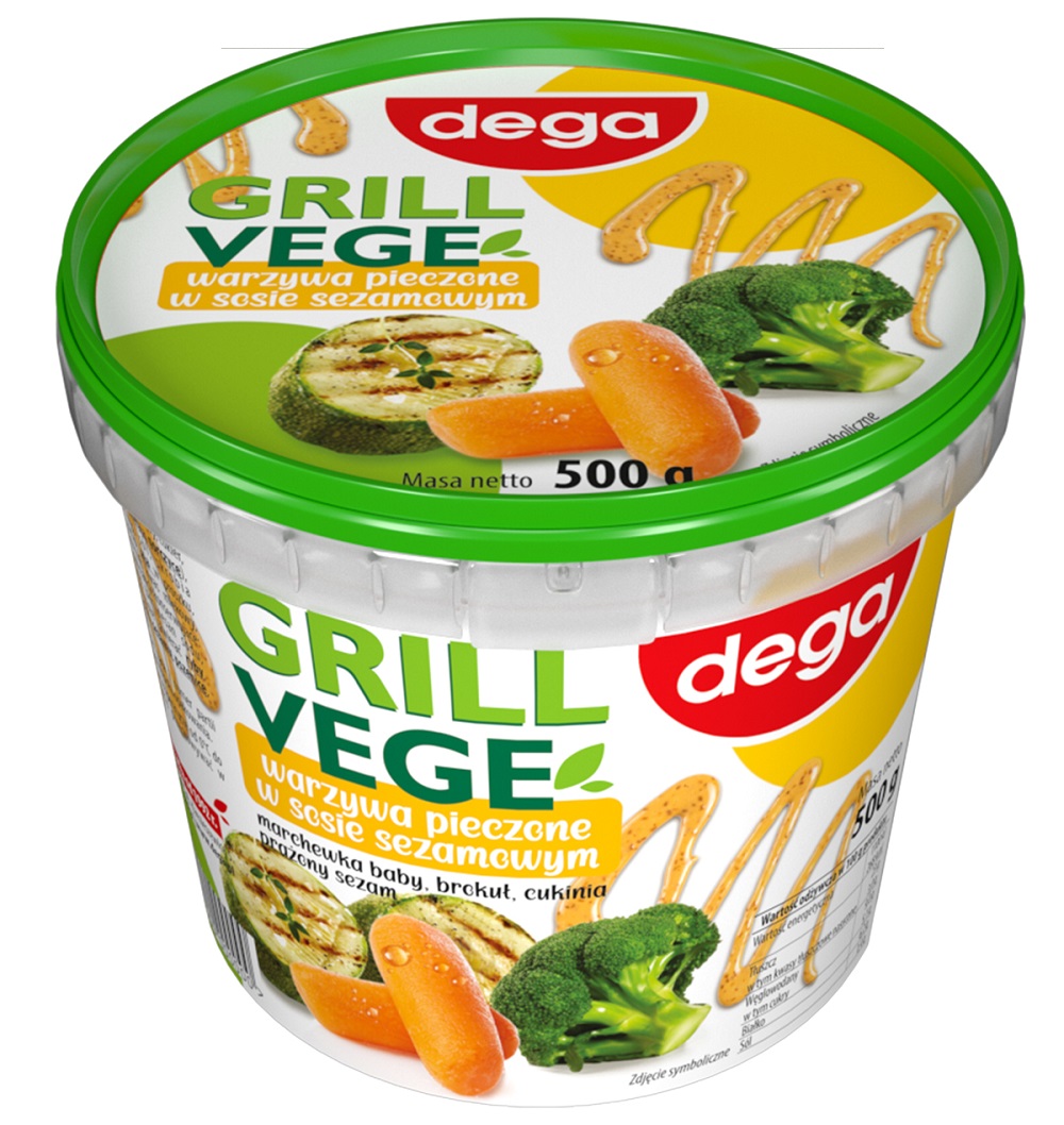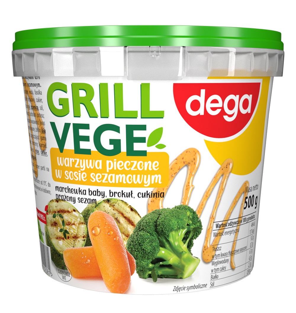 Składniki: cukinia, marchew, woda, fasolka szparagowa, brokuł, olej rzepakowy, cukier, nasiona sezamu, skrobia modyfikowana, sól, ocet spirytusowy, regulator kwasowości: kwas mlekowy; substancja konserwująca: sorbinian potasu; żółtko jaja w proszku, substancja zagęszczająca: guma ksantanowa; ziarno soi, pszenica. Produkt może zawierać ryby, seler, gorczycę, mleko, skorupiaki. Należy spożyć do: data i numer partii podane na wieczku lub boku opakowania. Przechowywać w temperaturze od 0 °C do +6 °C. Po otwarciu przechowywać w lodówce, spożyć w ciągu 24 godzin.